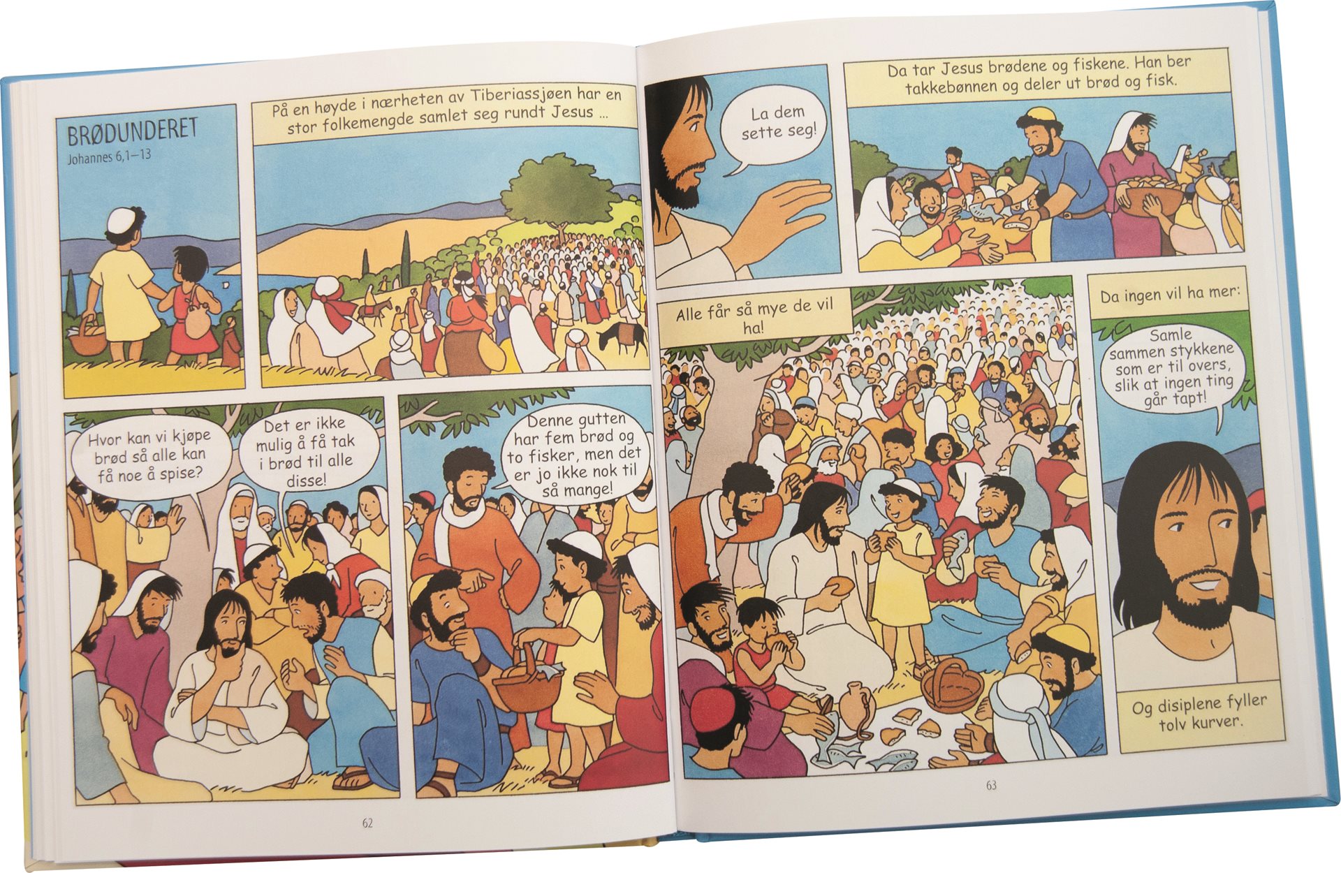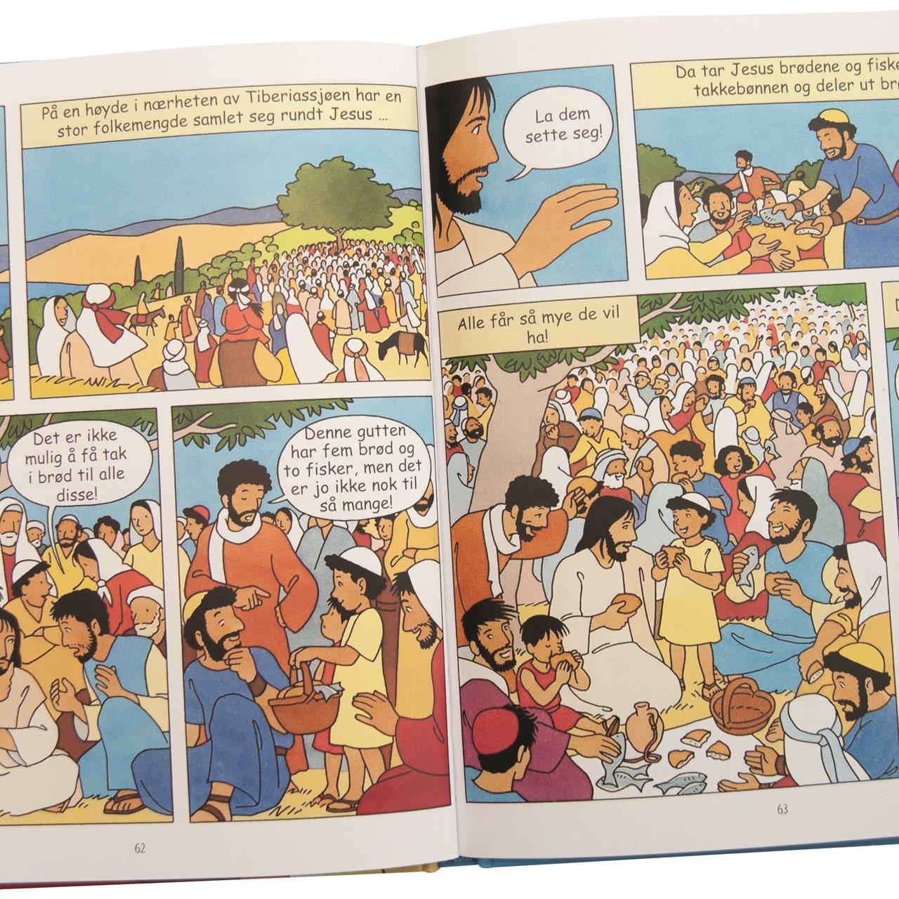 Denne barneboka inneholder 50 fortellinger fra Det nye testamentet, fortalt som tegneserie. Boka passer for barn som vil lese selv eller sammen med familien. Den har enkle ord og vakre illustrasjoner i klare farger.