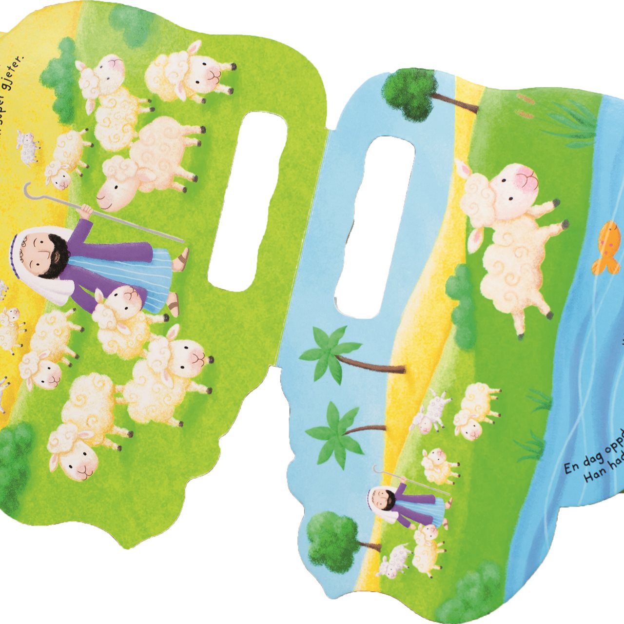 Det lille lammet Krølle er veldig nysgjerig og roter seg bort fra flokken. Heldigvis finner gjeteren igjen Krølle. Barnebok i kartong der bena kan "hoppe" opp og ned.