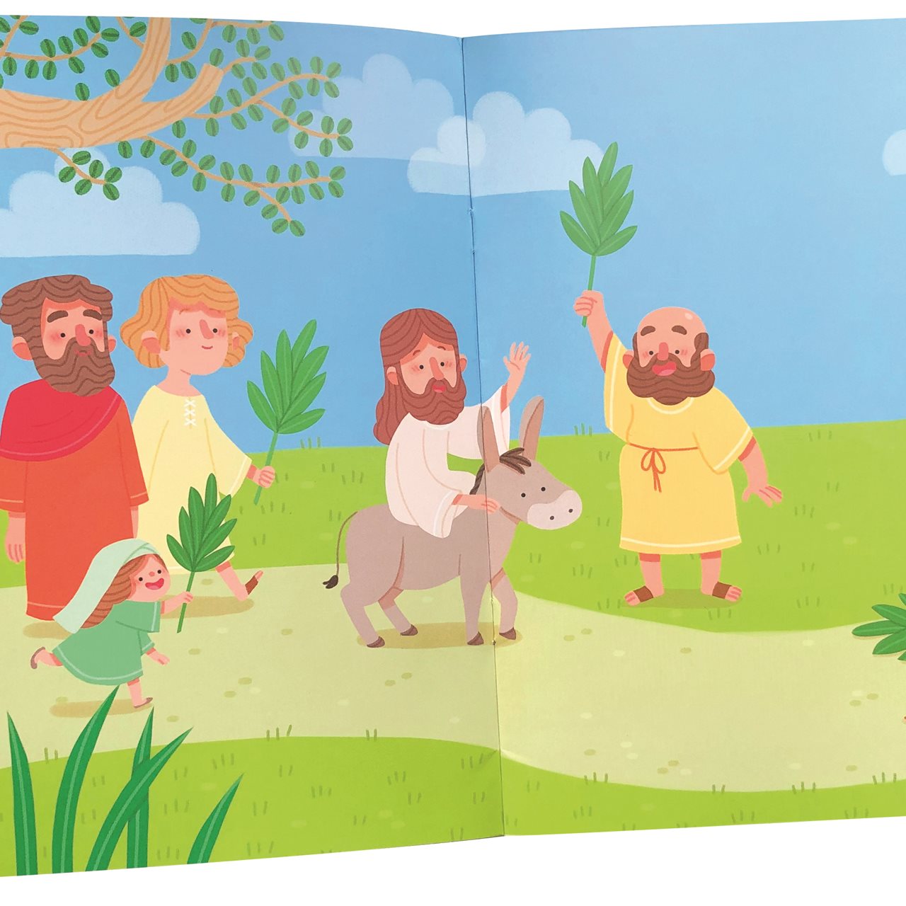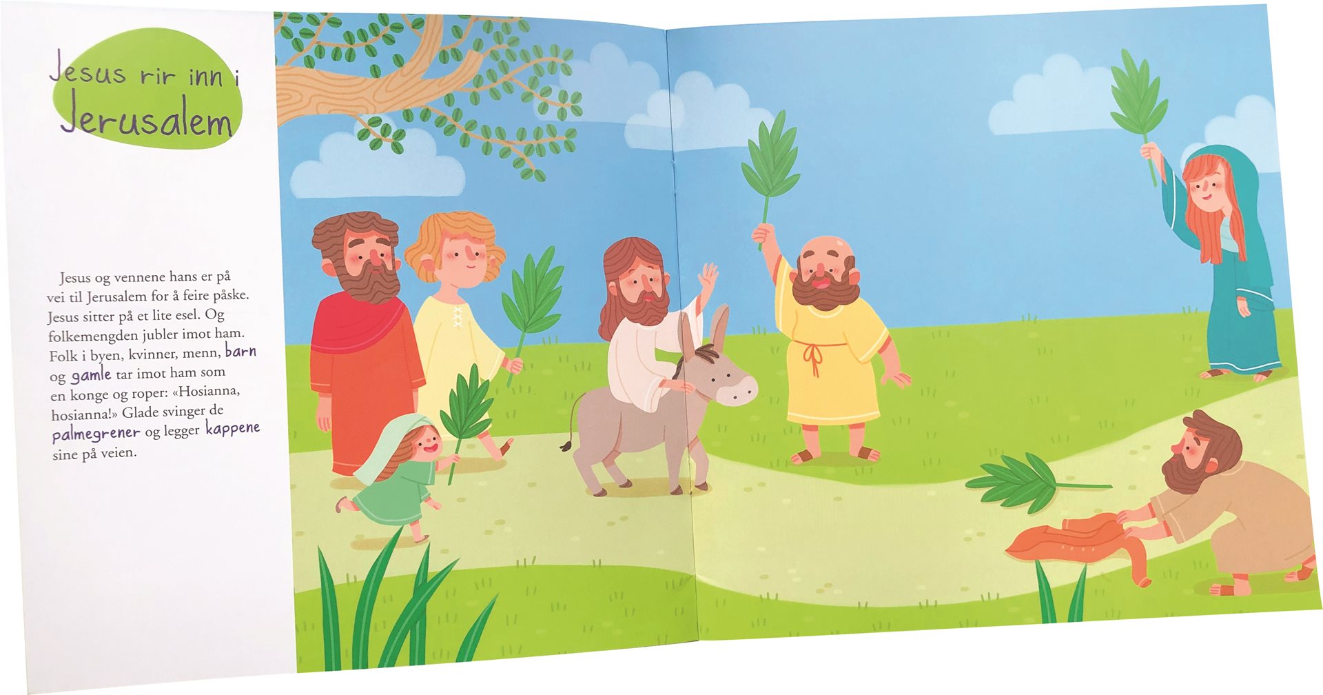 Barnebok der vi i seks store bilder følger Jesus og disiplene fra Jesus rir inn i Jerusalem på palmesøndag, via det siste måltidet til Jesu død og oppstandelse. Vi blir med to disipler på vei til Emmaus og når Jesus viser seg for vennene sine etter at han har stått opp.