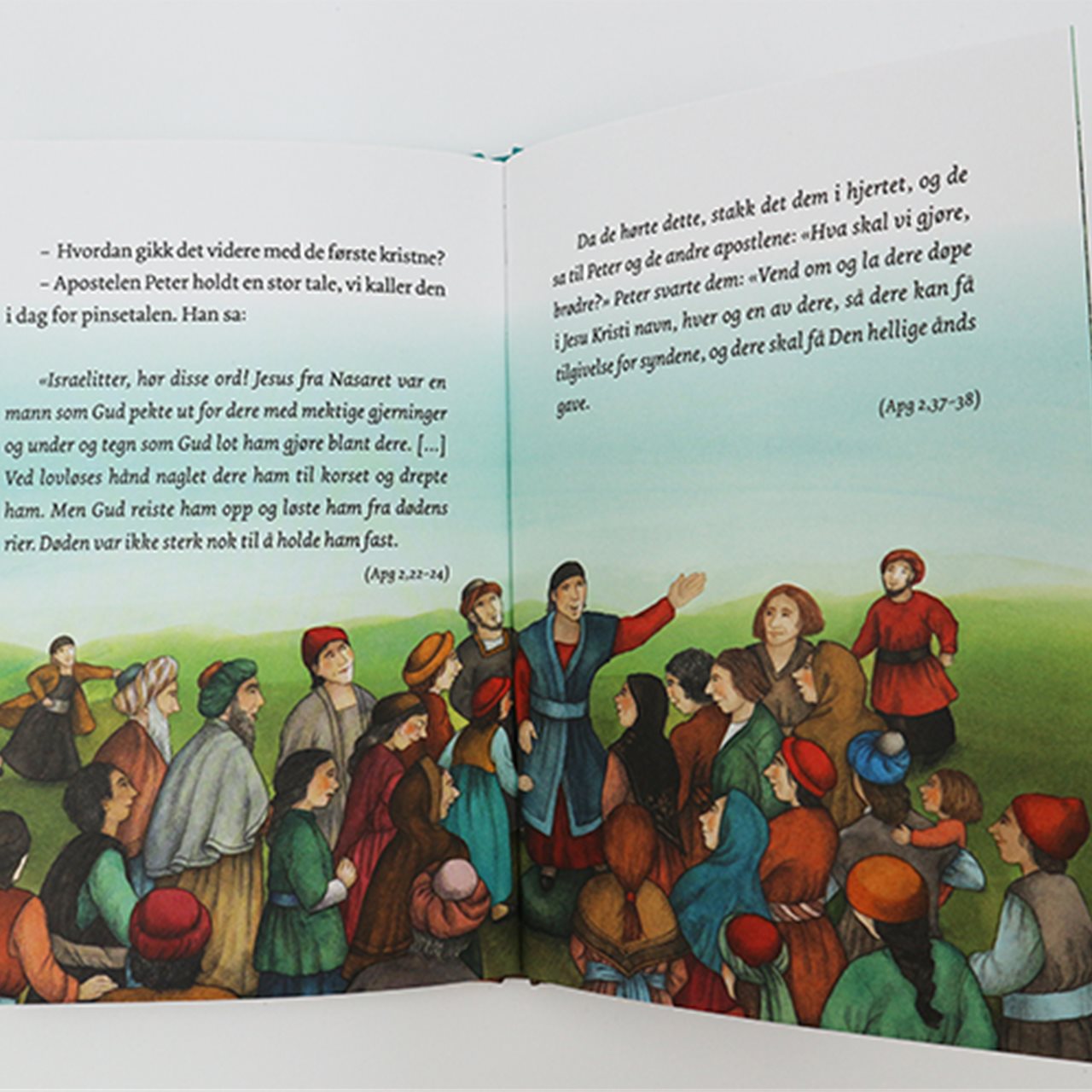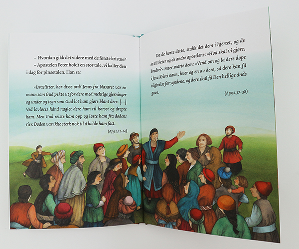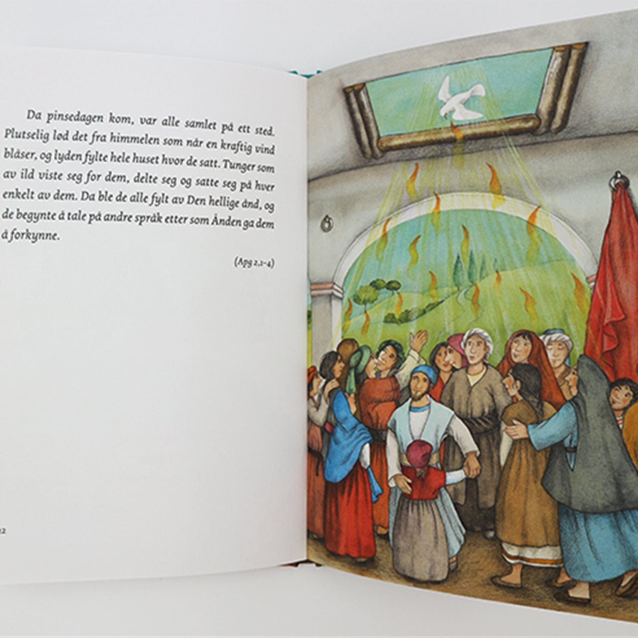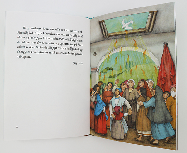 Forfatteren viser på en lettfattelig og klok måte til de bibelske tekstene og hendelsene etter Jesu død og oppstandelse. Det blir en flott innføring om Den hellige ånd, kirkens begynnelse og fellesskapet blant de første kristne. Her trekkes skapelsen og tårnet i Babel inn som viktige veivisere til å forstå grunnlaget for de senere hendelsene og premisset om fellesskapet mellom mennesker og mellom mennesker Gud blir løftet fram. Rikt llustrert barnebok for barn fra 10 år