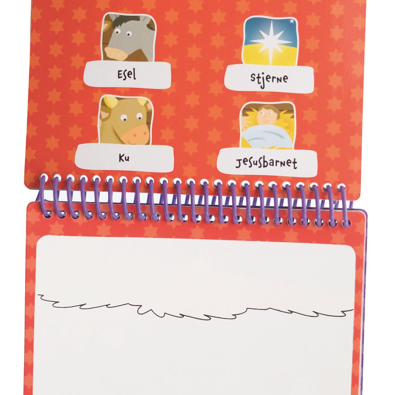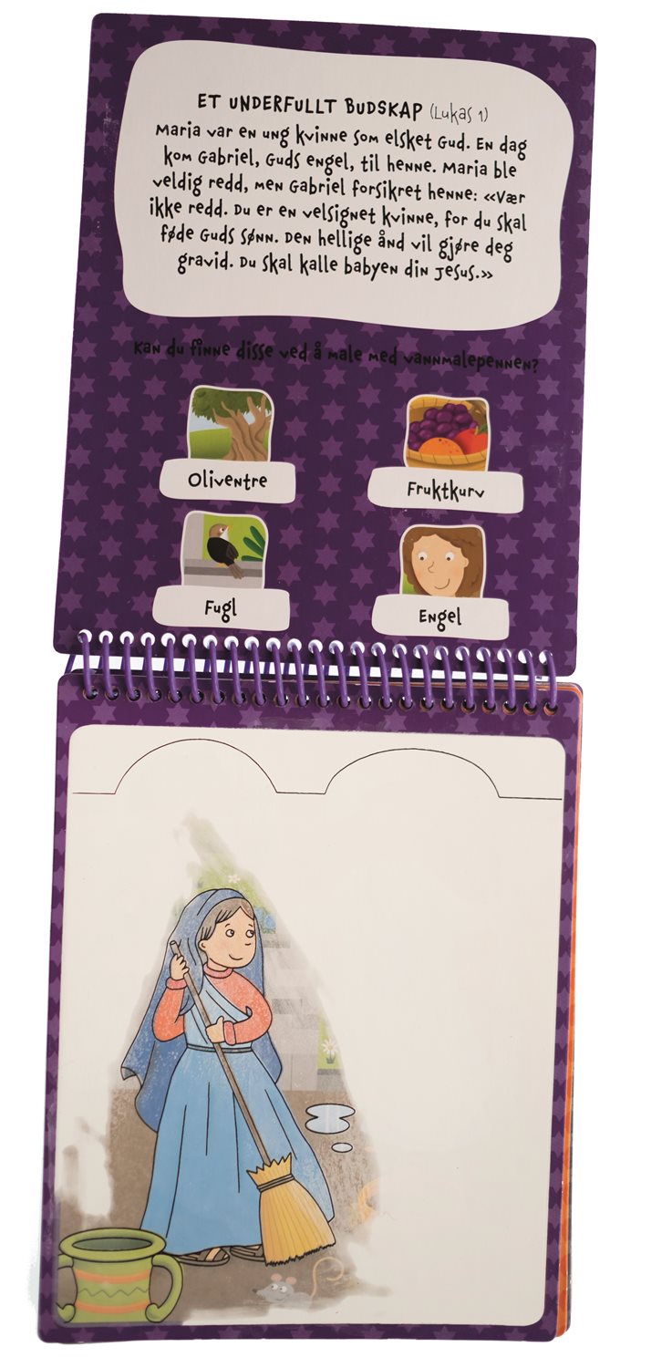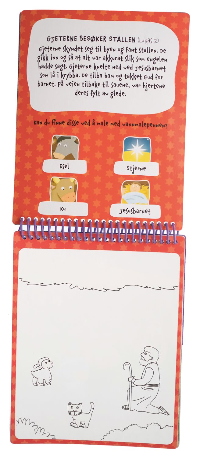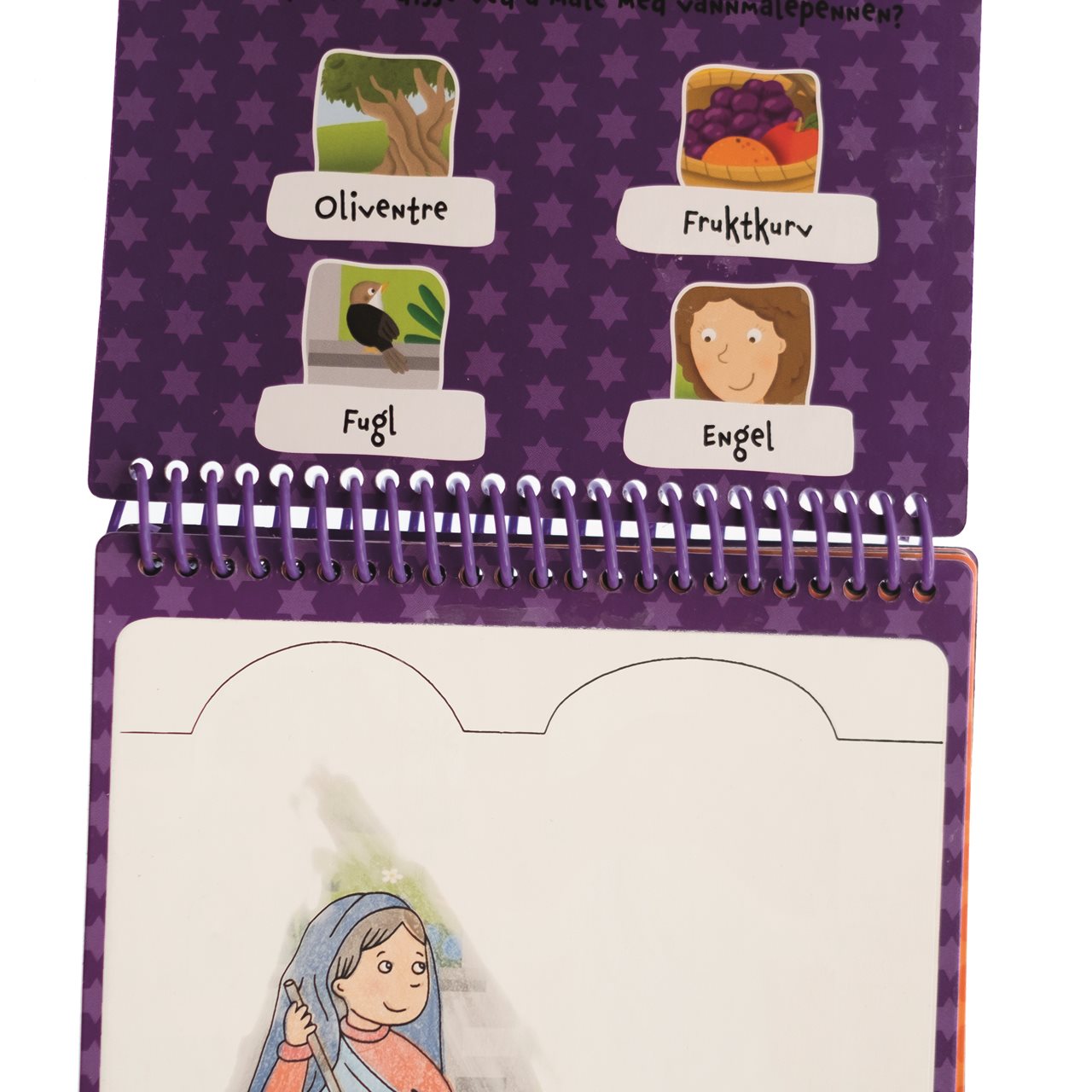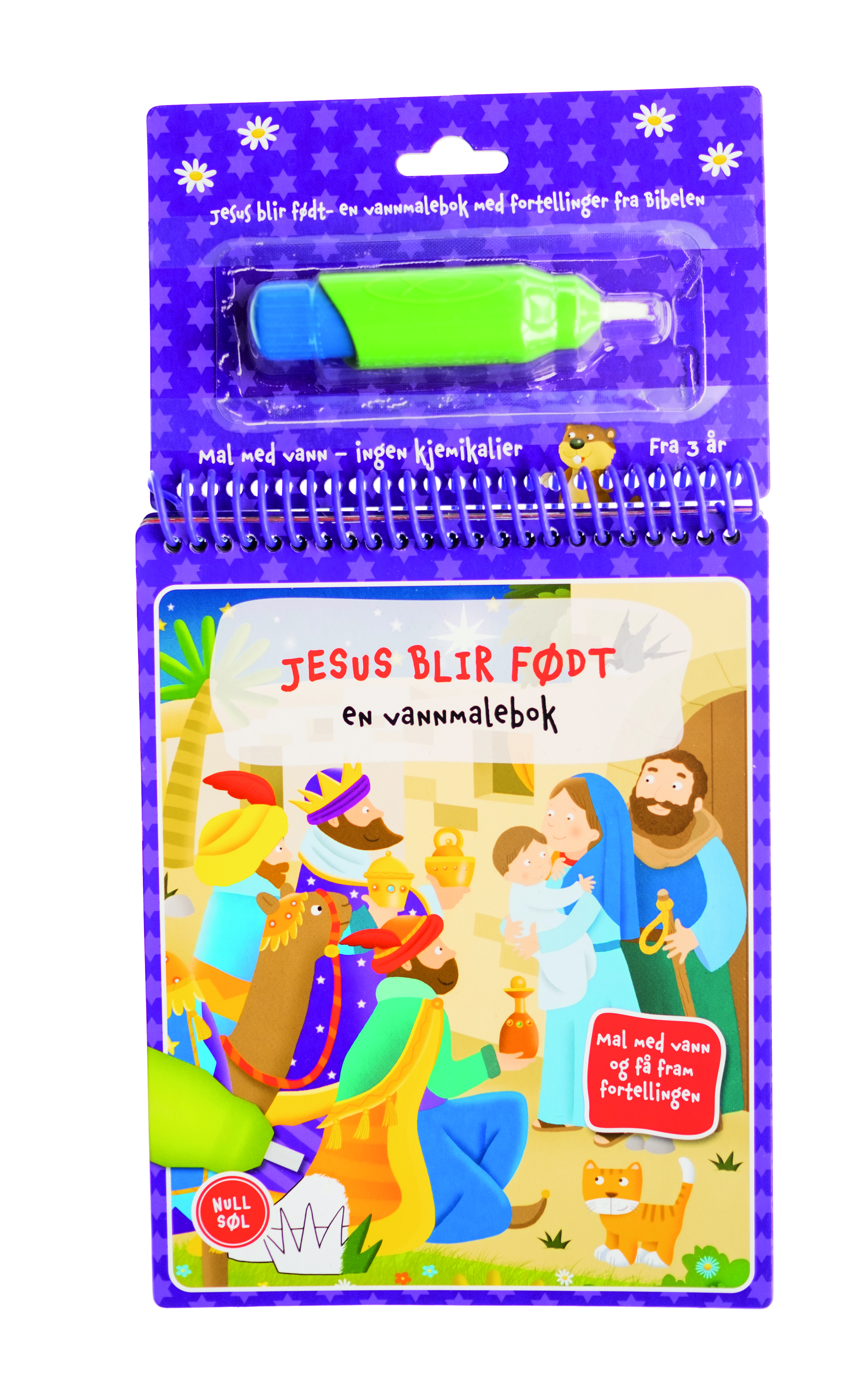 En morsom aktivitetsbok med fortellingen om Jesu fødsel. Inneholder fem flotte illustrasjoner, som males fram med en vannpenn. Barna kan la seg forundre over detaljene de maler fram, mens de tas med gjennom historien. Her er det bare å fylle pennen med vann, og begynne å male. Når sidene tørker, vil fargene forsvinne igjen. Sidene kan altså males om og om igjen. Penn følger med.