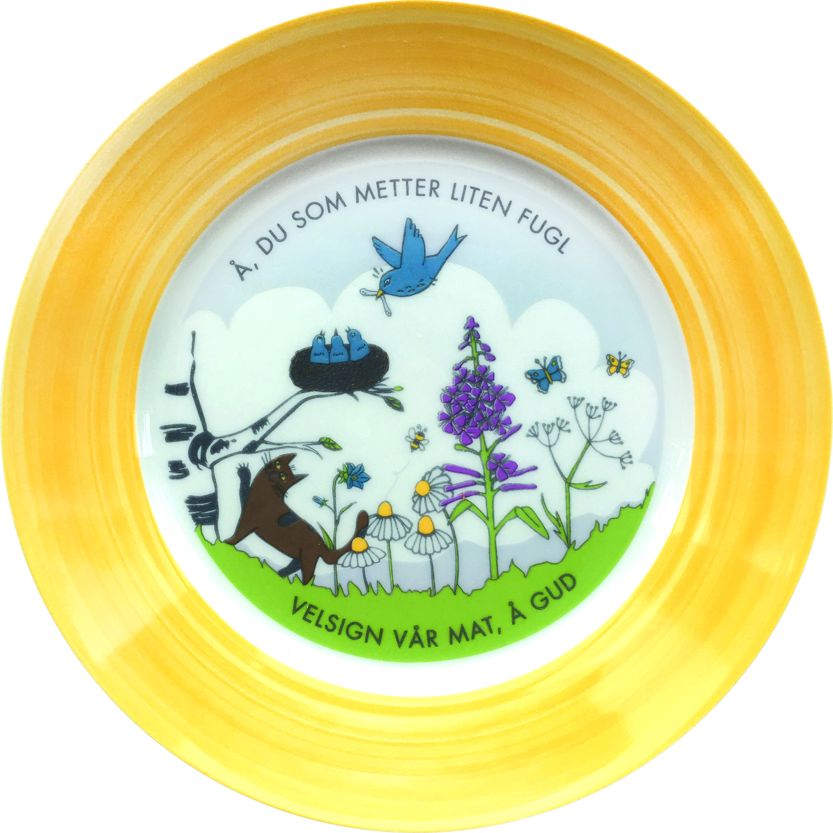 Robust, norskprodusert barnetallerken i Vitroporselen. Det er samme kvalitet som de andre kjente barnetallerkenene som finnes på markedet. Bordverset «Å, du som metter liten fugl» er lagt inn i illustrasjonen. Bildet i midten er brent inn, mens kanten rundt er håndmalt. En fin gave ved for eksempel dåp. Selges i eske.