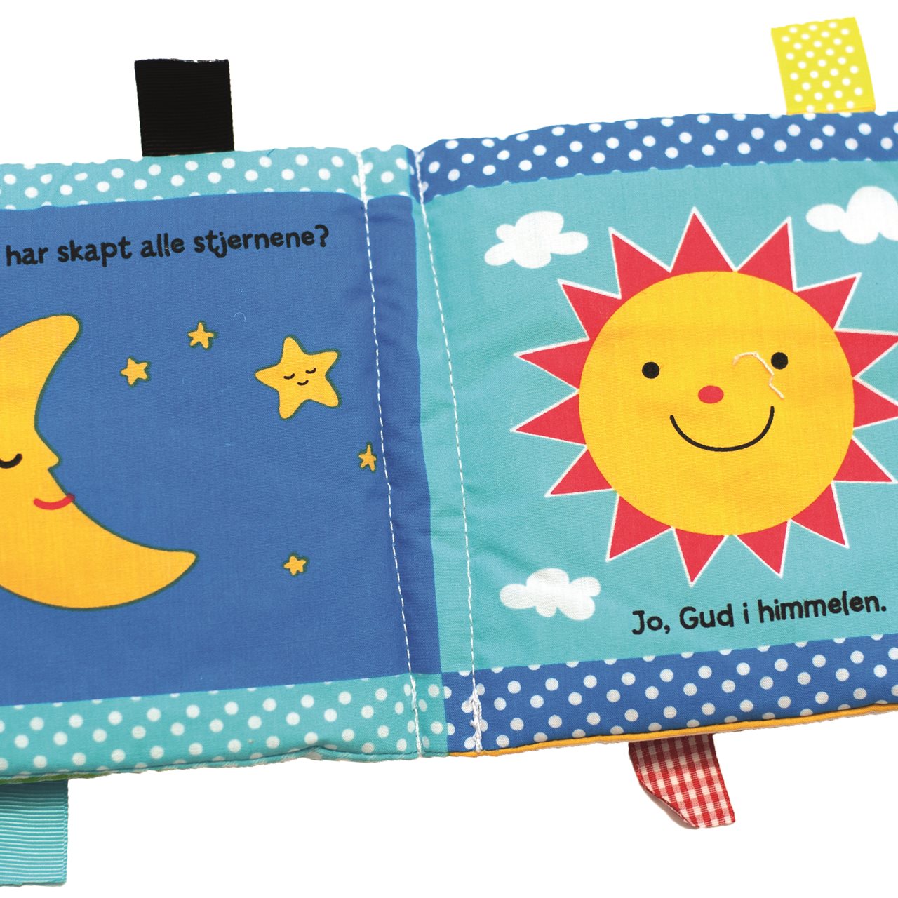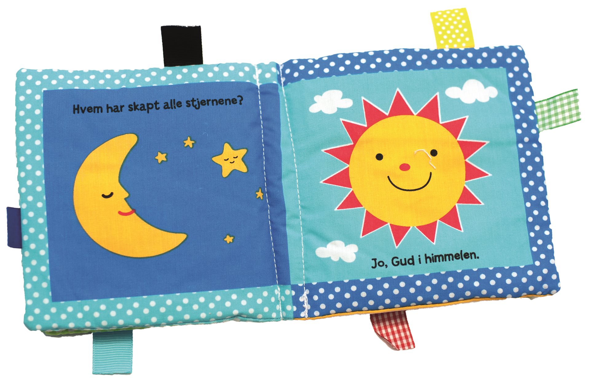 Myk og god barnebok for de minste barna med sangen Hvem har skapt alle blomstene? Fargeglade og tydelige tegninger viser hva Gud har skapt. Rasle- og ranglelyder når vi blar i boka.