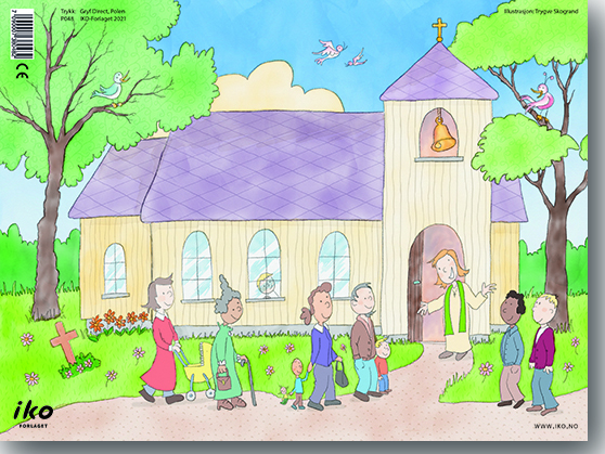 Puslespillet har ulikt bilde på fronten og bunnplaten – ferdig lagt viser spillet bilder av folk som kommer til kirken (eksteriør), mens bunnplaten viser det som foregår i kirken, under gudstjenesten (interiør). Bunnplaten har riss over bitene. 24 biter.