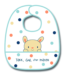 Takk, Gud, for maten står det på denne smekka. Den har oppsamlingslomme, og er laget i mykt, plastbelagt materiale. Den har borrelås og kan vaskes på 60 grader.
