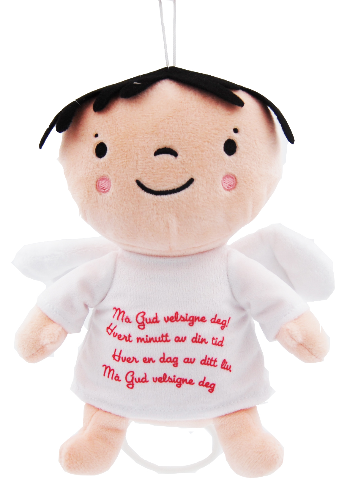 Engelen er myk og god, og kan koses med eller være med i lek og på reise.