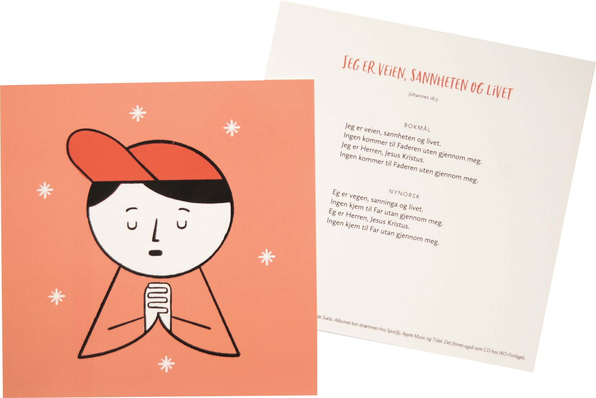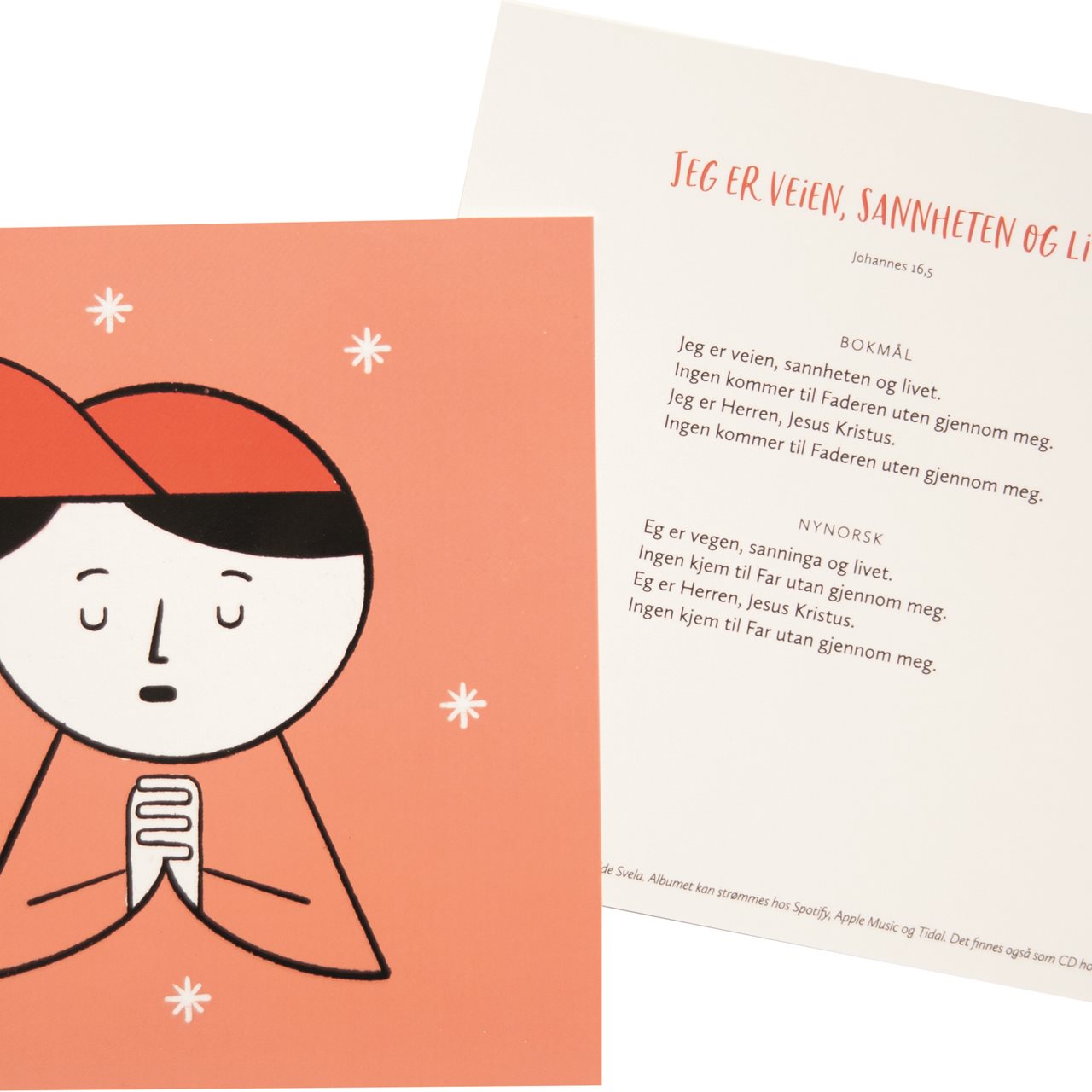 Sangkort med bilder og bibelvers. Tekstene i denne sangboksen er på bokmål og nynorsk. Illustrasjonene hjelper barna til å kjenne igjen bibelversene.