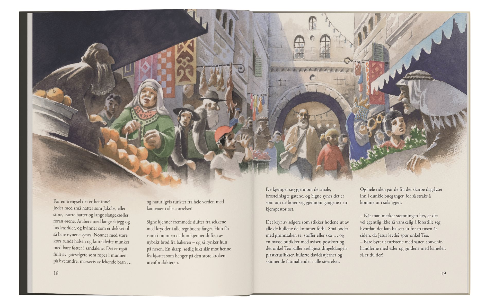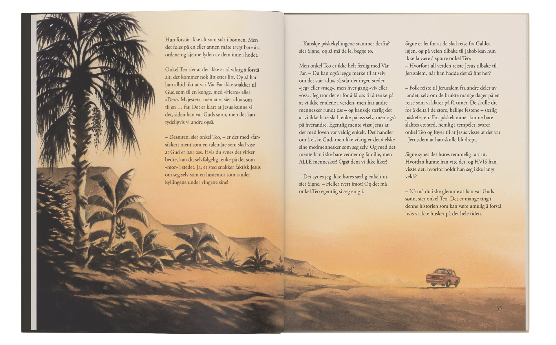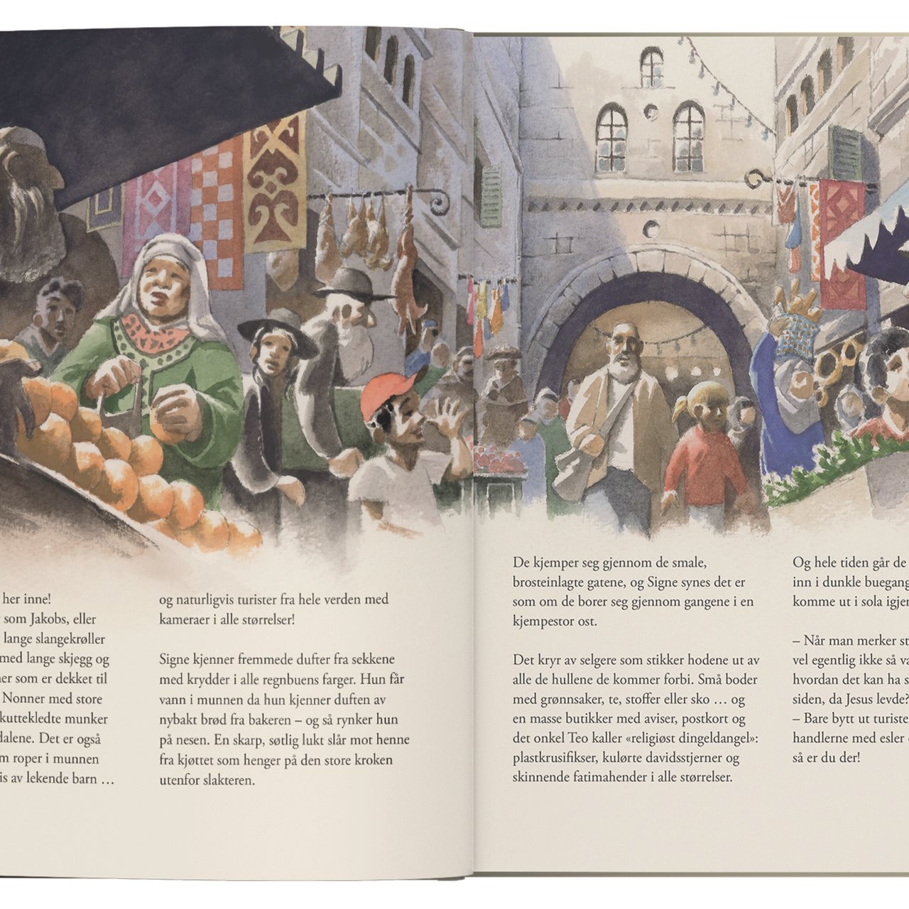 Reisen til Jerusalem er en fortelling i ord og bilder om Signe og onkel Teos tur til et land tre tusen kilometer borte. Det blir en reise mange hundre år tilbake i tid, til den gangen påskens historie ble til.